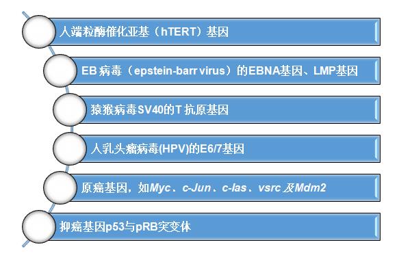由于體外培養(yǎng)細胞自發(fā)性永生化率非常低,目前普遍采用基因轉(zhuǎn)染技術(shù)將外源性永生化基因?qū)肽康募毎麅?nèi), 以增加永生化。永生化相關(guān)的外源基因。