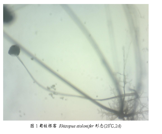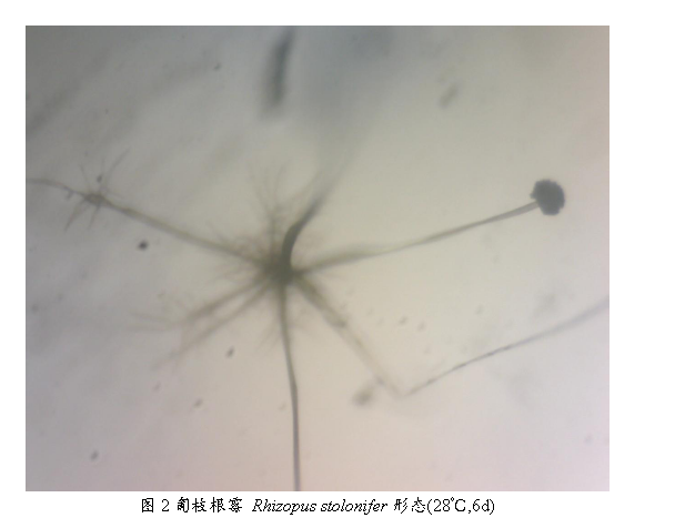 形態(tài)觀察特點(diǎn): 在PDA培養(yǎng)基上接種,28℃培養(yǎng)。第2天即可看到匍枝根霉產(chǎn)孢,且產(chǎn)孢較多,易觀察。其菌絲無隔膜、有分枝和假根,營養(yǎng)菌絲體上產(chǎn)生匍匐枝,匍匐枝的節(jié)間形成特有的假根,從假根處向上叢生直立、不分枝的孢囊梗,頂端膨大形成圓形的孢子囊,囊內(nèi)產(chǎn)生孢囊孢子。培養(yǎng)一周左右可看到明顯的孢子脫落。連續(xù)觀察2周,仍然可以看到明顯的產(chǎn)孢結(jié)構(gòu),菌絲、孢子囊、假根形態(tài)觀察明顯。