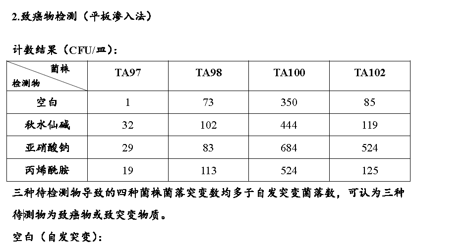 (3)表層培養(yǎng)基試管置于45℃水浴備用,依次加入TA97、TA98、TA100和TA102菌懸液0.1ml和待檢測(cè)致癌物質(zhì)0.1ml;