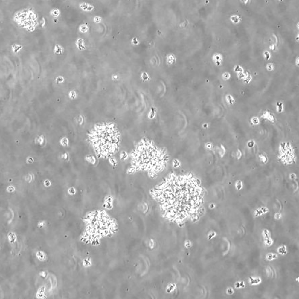 如果細胞密度達80%-90%,即可進行傳代培養(yǎng)。1. 棄去培養(yǎng)上清,用不含鈣、鎂離子的PBS潤洗細胞1-2次。2. 加2ml消化液(0.25%Trypsin-0.53mM EDTA)于培養(yǎng)瓶中,置于37℃培養(yǎng)箱中消化1-2分鐘,然后在顯微鏡下觀察細胞消化情況,若細胞大部分變圓并脫落,迅速拿回操作臺,輕敲幾下培養(yǎng)瓶后加少量培養(yǎng)基終止消化。3. 按6-8ml/瓶補加培養(yǎng)基,輕輕打勻后吸出,在1000RPM條件下離心4分鐘,棄去上清液,補加1-2mL培養(yǎng)液后吹勻。4. 將細胞懸液按1:2到1:5的比例分到新的含8ml培養(yǎng)基的新皿中或者瓶中。 |